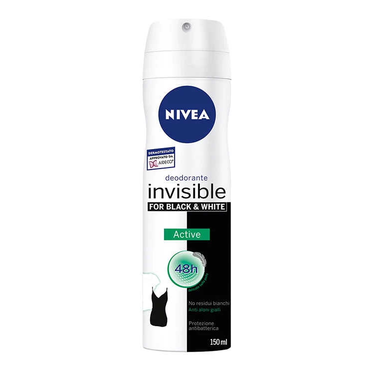 Invisible Black & White Active Spray offre la migliore protezione NIVEA per capi chiari e scuri in una nuova, freschissima fragranza. La sua formula dermotestata è approvata da AIDECO, l’ Associazione Italiana di Dermatologia e Cosmetologia. – Non lascia residui bianchi sui tessuti scuri – Riduce la formazione di aloni gialli sui tessuti chiari – Protezione antibatterica – Regola la traspirazione per 48h – Tollerabilità cutanea dermatologica-mente comprovata.