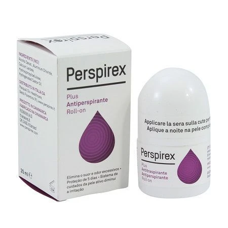 Perspirex Plus Antitraspirante Roll-on Formula che elimina l’eccessiva sudorazione e i cattivi odori e 1 applicazione dura fino a 5 giorni. Con sistema attivo “Active Skin Care” che riduce al minimo le irritazioni e consente un’ottima tollerabilità cutanea. Modalità d’utilizzo Si applica con 3 gesti: – applicare la notte sulla pelle pulita e asciutta e senza ferite o irritazioni. – ripetere questa applicazione per una settimana. – continuare ad applicarlo per 1-2 sere a settimana. Componenti Alcohol Denat., Aluminum Chloride, Calcium Lactate, Hydroxypropylcellulose, Hydrogenated Castor Oil. Formato Roll on da 25 ml Cod.7RI004